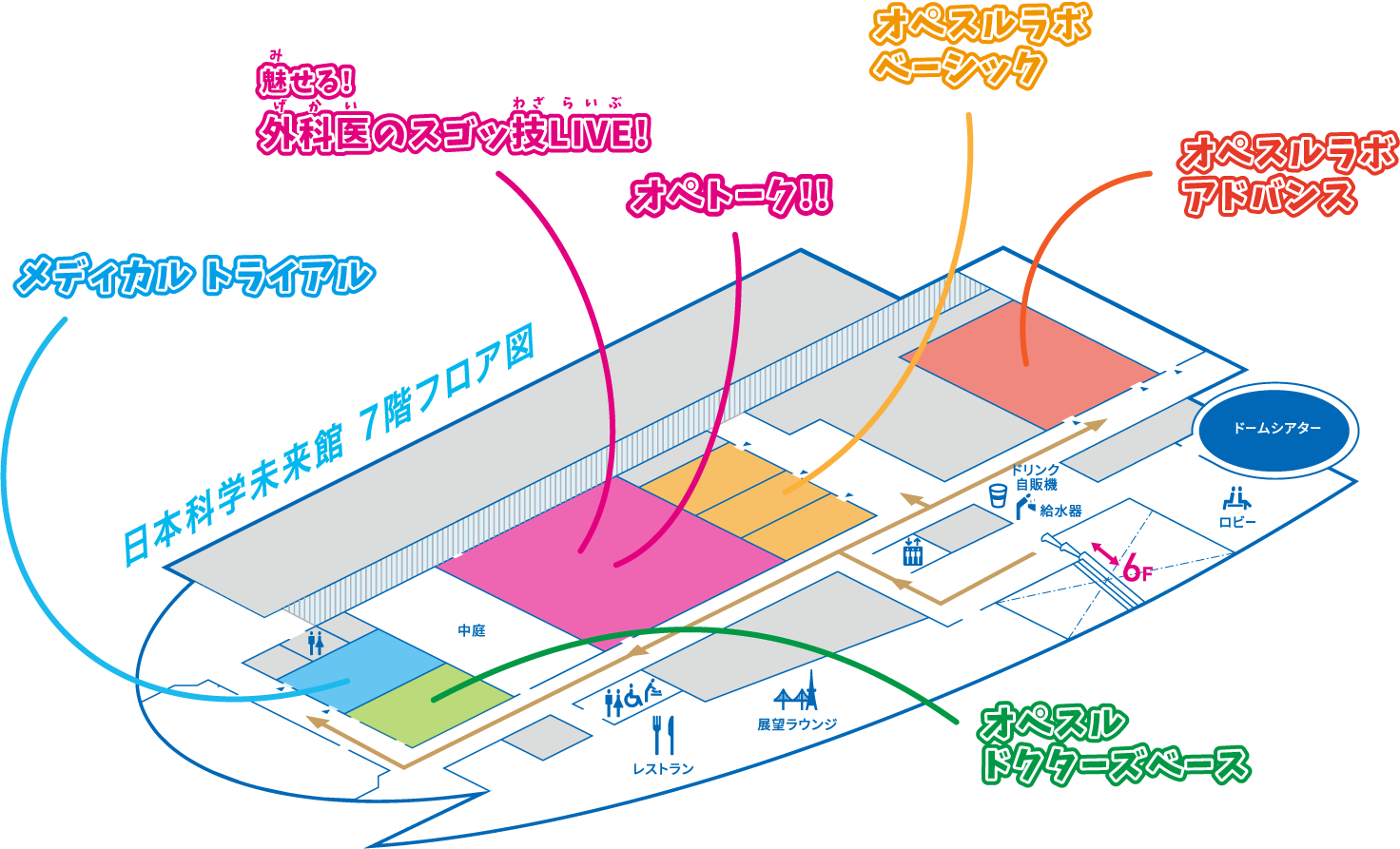ロボット手術や自動縫合機、ポイを使った縫合体験等。