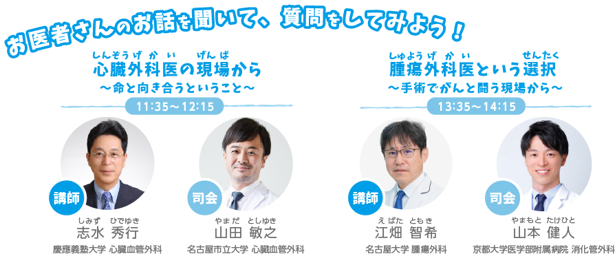 外科のお医者さんとお話ししよう第一線の医師による講演を聞いて、質問も出来ます。 ここでしか聞けない役立つ知識がたくさんあります。